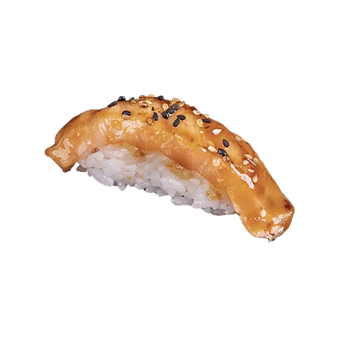 Sushi waarbij een klein bolletje rijst met de vingers gevormd wordt, met daar bovenop een stukje geflambeerde ei