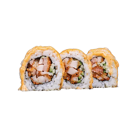 Een rol van rijst met aan het buitenkant tempura flakes en in het midden van de rol gefrituurde kip en komkommer sliertjes