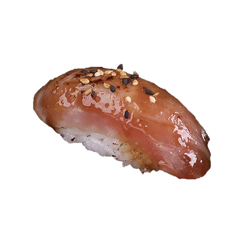 Sushi waarbij een klein bolletje rijst met de vingers gevormd wordt, met daar bovenop een stukje geflambeerde tonijn