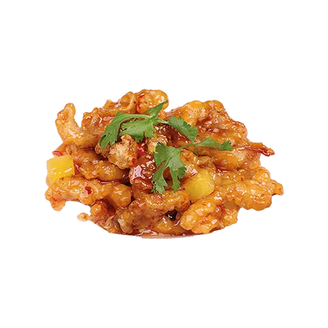 Kip blokjes gebakken met ui, paprika en een zoete, fris en, pikant sausje