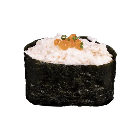 Een ovaalvormig bootje van Nori en sushirijst, gevuld met krab