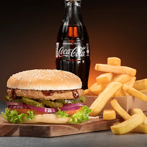 Onze vegetarische burger menu's worden geserveerd met vegetarische burger frites en een frisdrank naar keuze