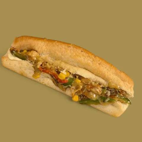 Kipfilet, maïs, champignon, mozzarella, augurk, knoflooksaus en mayonaise