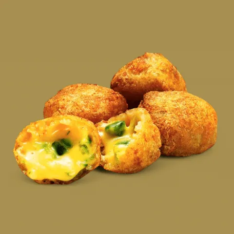 Met friet, chicken strips, mozzarella kaas, cheddar cheese saus, BBQ-saus, samuraisaus, mayonaisesaus en jalapeñopeper