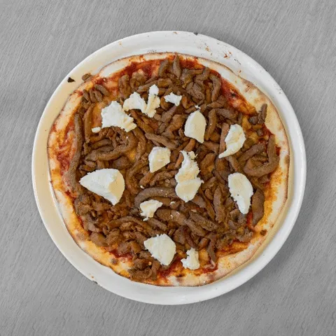 Dubbelgevouwen pizza met shoarmavlees en knoflooksaus