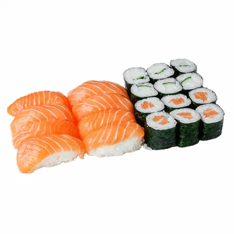 6 zalm nigiri, 6 zalm maki, 3 Lion King roll, 3 zalm California, 3 cheese maki, 3 crispy zalm en 2 zalm handroll