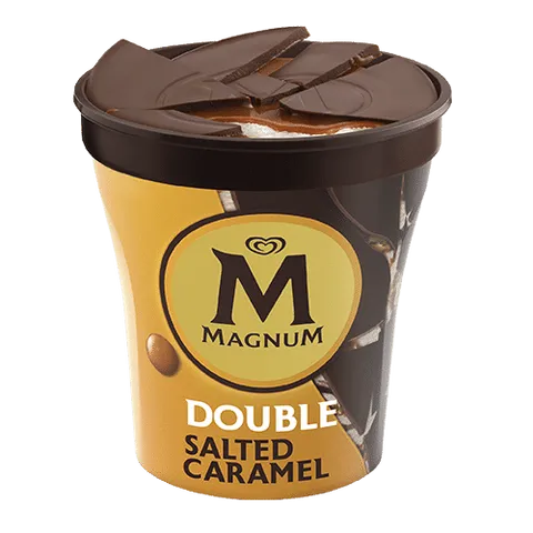 Fluweelzacht vanille-ijs met stukken chocolade, zeezout kristallen en karamel, overgoten met karamelsaus en geheel omhuld met een dikke laag krakende Magnum chocolade