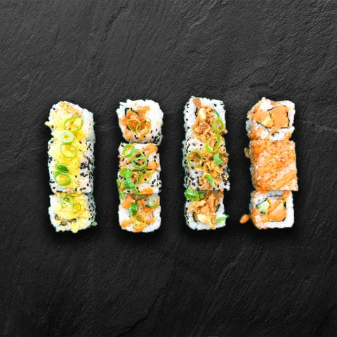 8x spicy chicken 8x ebi truffel 8x California roll 8x uramaki salmon 8x dragon roll 6x kappa maki 6x sake maki