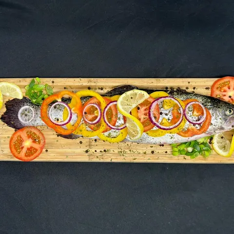 Hele verse forel uit de oven met verse groenten, geserveerd met friet en een frisse salade