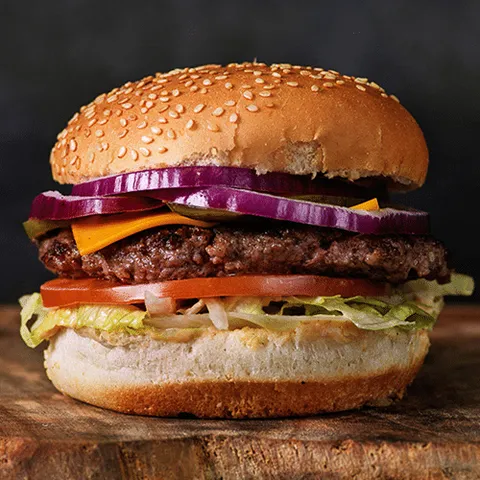 Verse huisgemaakte burger van 100% rundvlees met cheddar kaas, sla, tomaat, rode ui en augurk. Geserveerd op een geroosterd sesambroodje met speciaal gemaakte burgersaus